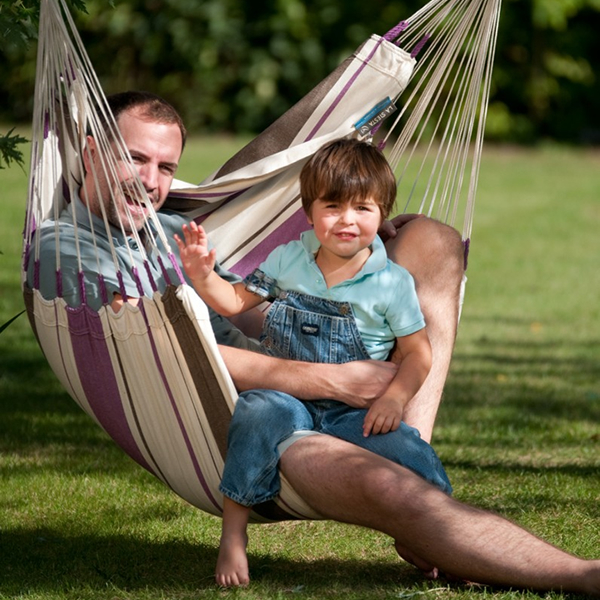 フレッシュなパープルストライプのハンモックチェア ベーシック ”カリベニャ パープル"は、小スペースでも快適に楽しめるハンモックです。お部屋の中や庭の木に吊るして楽しんでください。もちろんキャンプやビーチなどのアウトドアでもご使用頂けます。